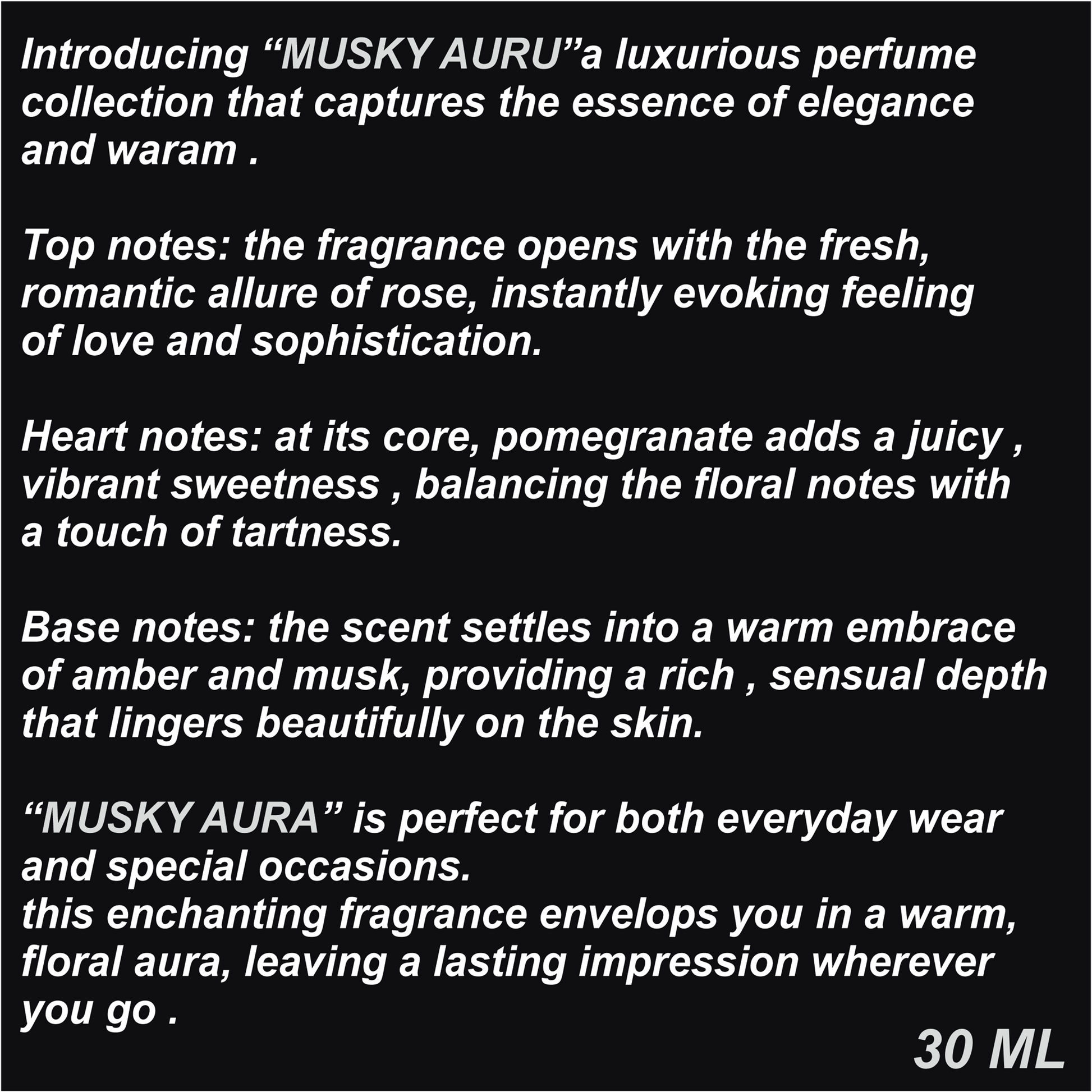 Introducing "Musky Aura," a luxurious perfume collection that captures the essence of elegance and warmth.
